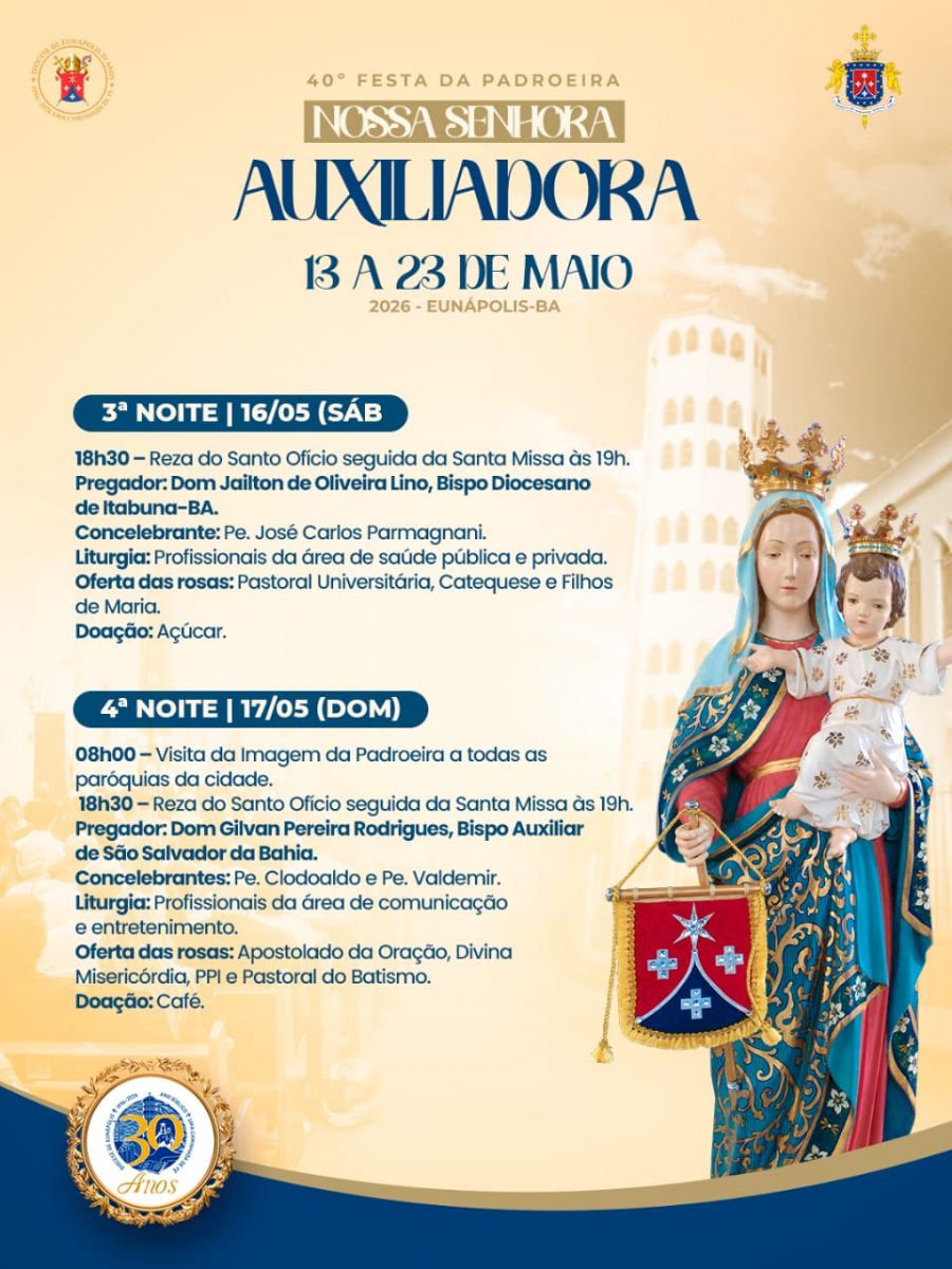 As celebrações a Nossa Senhora Auxiliadora começam dia 13 de maio com o novenário à padroeira de Eunápolis. O Ano Vocacional será celebrado com o tema “Nos 30 anos de nossa Diocese, a Rainha presente está : Pentecostes acontecerá. ”.