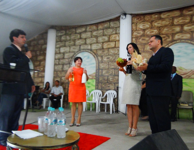 O prefeito Neto Guerrieri com a primeira Dama Ciça e a vice-prefeita Maria Menezes, em culto de agradecimento na Igreja Betel, pela sua posse.