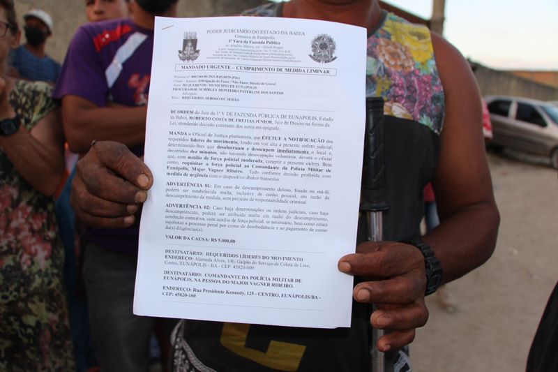 Após 48 horas de protesto contra a prefeita de Eunápolis Cordélia Torres, cerca de 60 famílias que trabalhavam no lixão de Eunápolis, foram retiradas da frente do galpão onde ficam os caminhões da coleta do lixo na cidade, através de um cumprimento de medida liminar, expedido pela justiça nesta terça-feira (25/05).