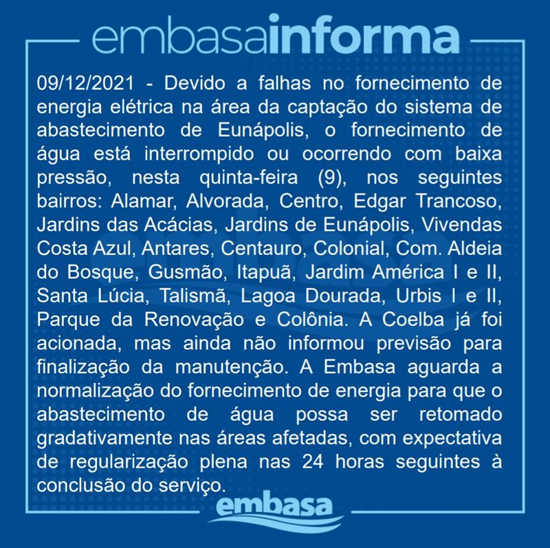 Na manhã desta quinta-feira (09/12), a Embasa informou que devido a falhas no fornecimento de energia elétrica na área de captação do sistema de abastecimento alguns bairros de Eunápolis estão com o fornecimento de água interrompido.