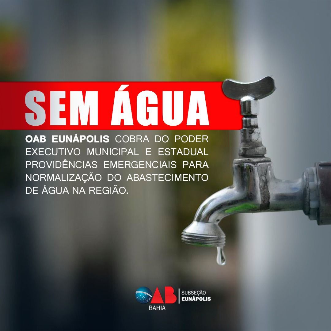 A Comissão de Defesa do Meio Ambiente da OAB Subseção de Eunápolis, protocolou nesta segunda-feira (13), através da Comissão de Meio Ambiente, um requerimento aos representantes do poder executivo Municipal e Estadual exigindo PROVIDÊNCIAS EMERGENCIAIS para imediata normalização do abastecimento da água, que possui natureza essencial para qualquer ser humano.
