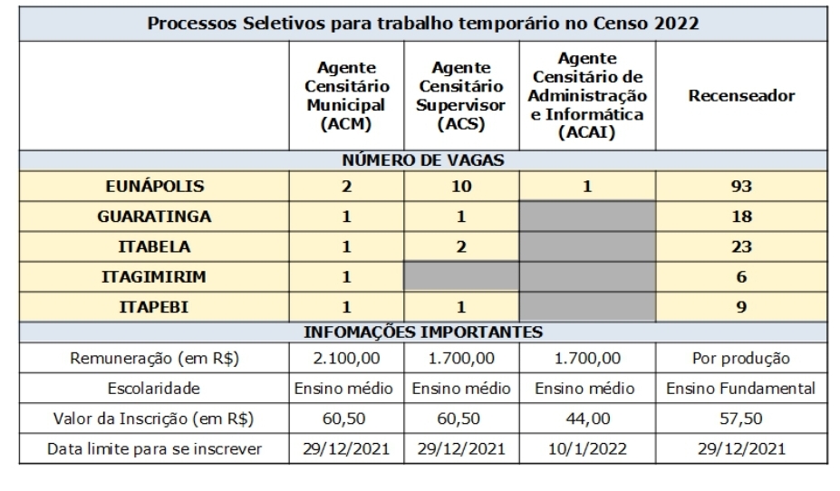 O quadro a seguir traz um resumo das vagas temporárias para o Censo 2022 nas cidades de Eunápolis, Guaratinga, Itabela, Itagimirim e Itapebi.