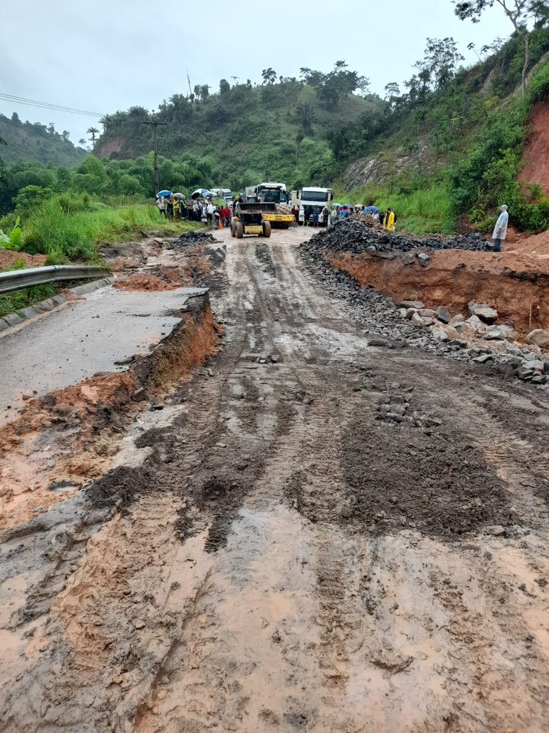 Empresa atua junto com as autoridades para a recuperação de um ponto da rodovia que cedeu devido aos impactos das chuvas e interditou a estrada próximo ao trecho de divisa entre Eunápolis e Itabela