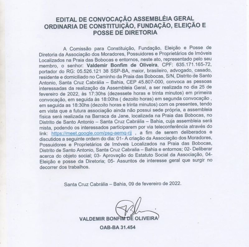 Nesta quarta-feira (09/02), a Associação dos moradores, possuidores e proprietários de imóveis na Praia das Bobocas em Santa Cruz Cabrália divulga edital de convocação para Assembleia Geral Ordinária de Constituição, Fundação, Eleição e Posse de Diretoria.