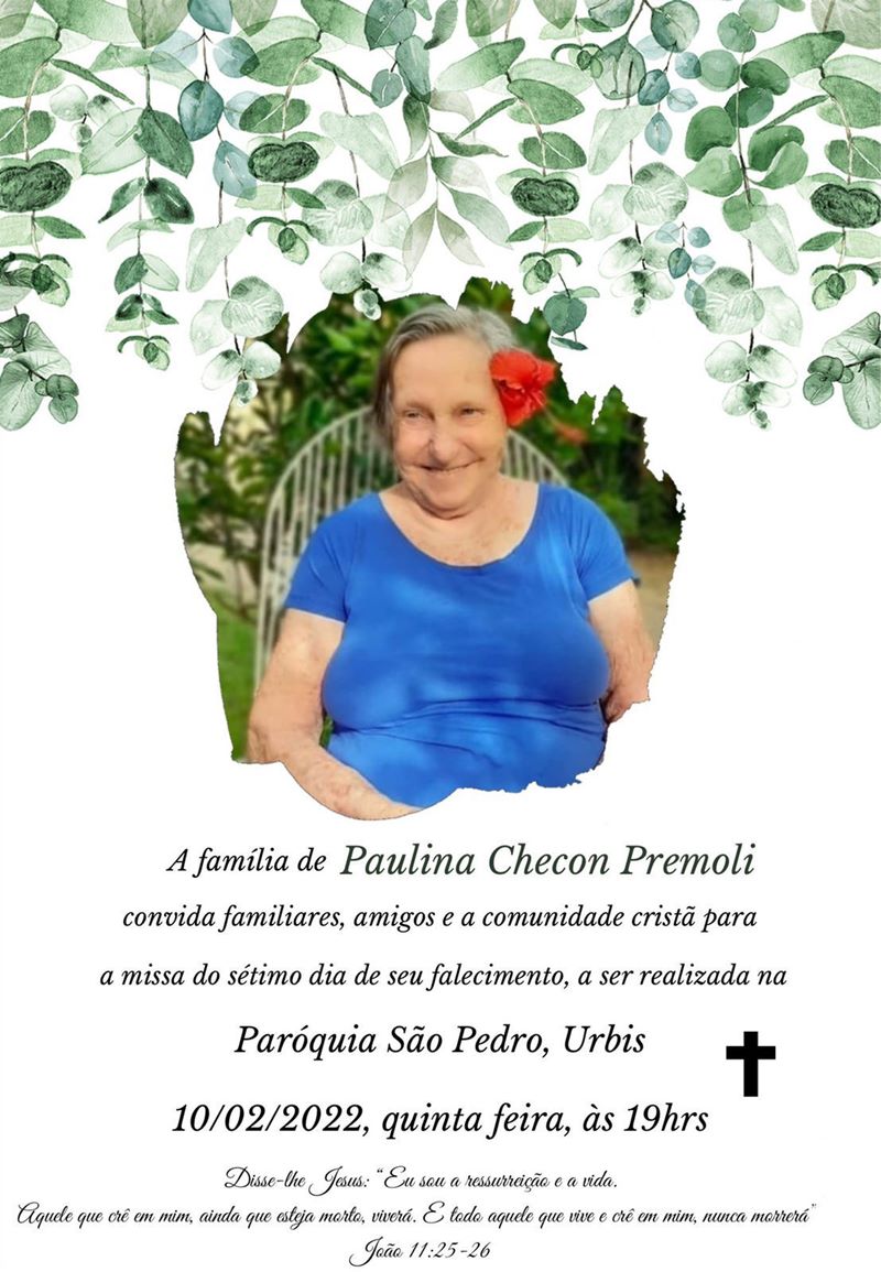 A missa de sétimo dia de Paulina Checon Premoli acontece nesta quinta-feira (10/02), a partir das 19h. Será realizada na Paróquia São Pedro na Urbis II em Eunápolis.