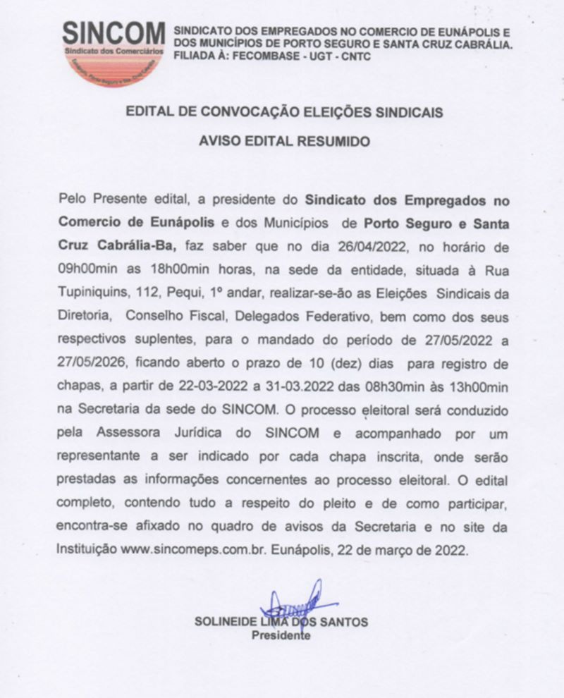 Eunápolis - Nesta terça-feira (22/03), o Sindicato dos Comerciários divulgou um edital de convocação de eleições sindicais.