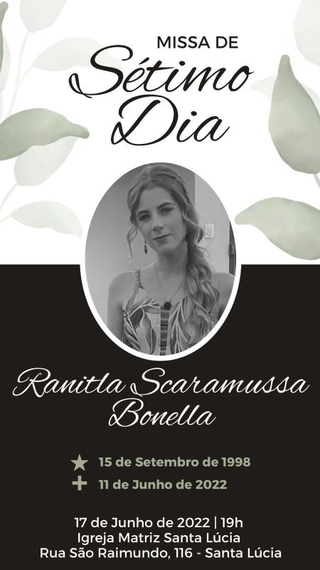 A missa de sétimo dia de Ranitla Scaramussa Bonella, morta por atropelamento no último dia 11, acontecerá às 19h desta sexta-feira (17), na Igreja Matriz Santa Lúcia, em Eunápolis.
