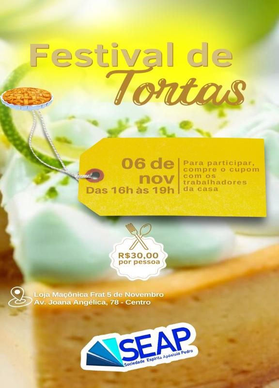 Doces, salgadas, de diversos sabores... assim será o cardápio do Festival de Tortas que será realizado no dia 6 de novembro em Eunápolis. Promovido pela Sociedade Espírita Apóstolo Pedro (SEAP), o evento será sediado na Loja Maçônica 5 de Novembro (Av. Joana Angélica, 78, Centro).