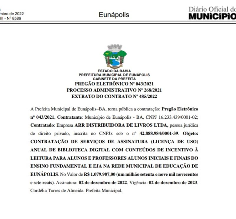 Na última sexta-feira (02/12), foi publicado no diário oficial do município de Eunápolis, a contratação de uma Biblioteca Digital que custará aos cofres públicos R$ 1.079.907,00 (um milhão setenta e nove mil novecentos e sete reais).