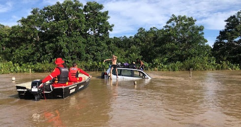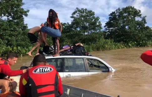 Dois homens foram resgatados após o carro em que estavam ficar quase submerso. O fato ocorreu na manhã desta terça-feira (27) próximo à entrada de Canavieiras, no Litoral Sul. Os dois trafegavam em uma ponte, que faz ligação entre a BR-101 e a BA-001, quando o rio transbordou e atingiu o veículo. Segundo o Corpo de Bombeiros Militar da Bahia (CBMBA), uma equipe de Ilhéus se deslocou para o local e iniciou o resgate.