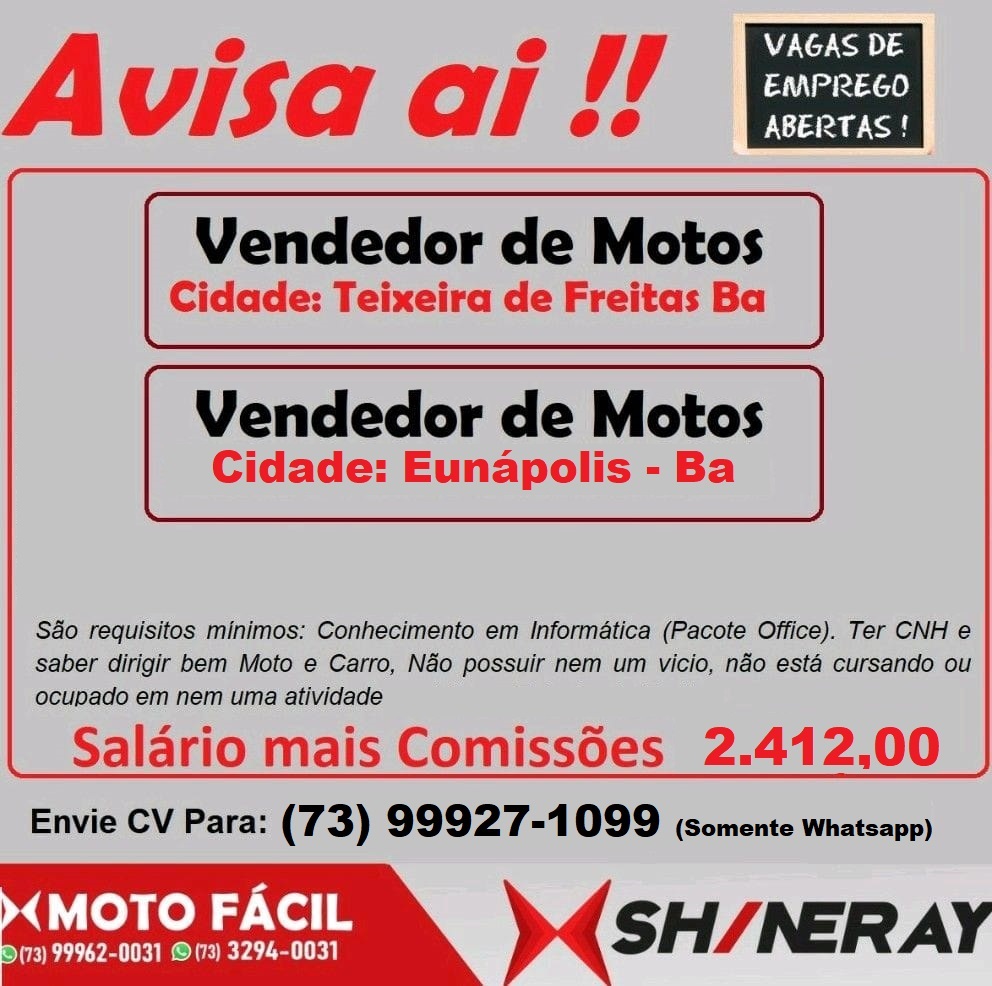 A Shineray, loja de veículos, abriu vagas de emprego para vendedores de motos nas cidades de Eunápolis e Teixeira de Freitas, extremo sul do estado. São requisitos mínimos: conhecimento em informática (pacote Office), possuir Carteira Nacional de Habilitação (CNH), dirigir bem moto e carro, não possuir vícios e não estar cursando ou ocupando outra atividade.