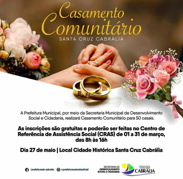 A Prefeitura de Santa Cruz Cabrália, por meio da Secretaria Municipal de Desenvolvimento Social e Cidadania, está preparando um evento muito especial. No dia 27 de maio, na Cidade Histórica, será realizado o casamento comunitário, oficializando a união dos casais da cidade.