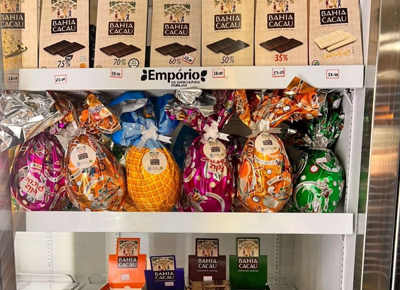 Em Salvador, soteropolitanos e turistas encontram, no Empório da Agricultura Familiar, localizado no Rio Vermelho, diferentes tipos de chocolates, com percentuais de 35% a 100% de cacau, produzidos por agricultores e agricultoras familiares que, reunidos em cooperativas, estão se qualificando e diversificando a produção.