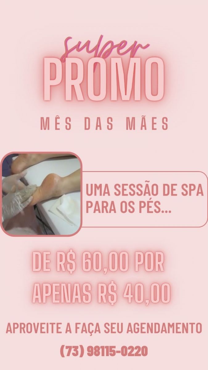 Para o Dia das Mães ser ainda mais especial e você poder demonstrar todo o seu amor e admiração, preparamos uma Super Promoção para este Mês de Maio, para todas as mamães. Venha conhecer uma das nossas seções, onde buscamos atender pessoas que precisam de cuidados nos pés, cuidados esses, que vão muito além de embelezamento, oferecemos o tratamento ideal para hidratar e relaxar a região dos pés. Não importa que tipo de mãe você quer presentear.