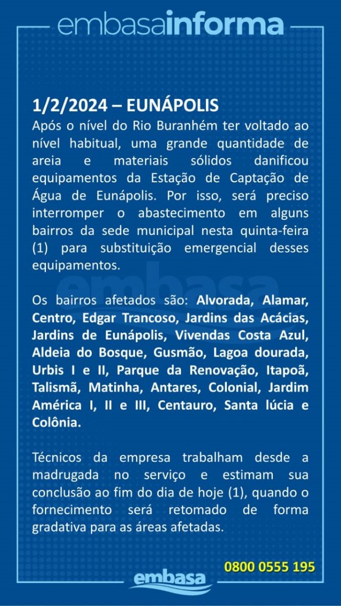 Após o nível do Rio Buranhém ter voltado ao nível habitual, uma grande quantidade de areia e materiais sólidos danificou equipamentos da Estação de Captação de Água de Eunápolis. Por isso, foi preciso interromper o abastecimento em alguns bairros da sede municipal nesta quinta-feira (1) para substituição emergencial desses equipamentos.