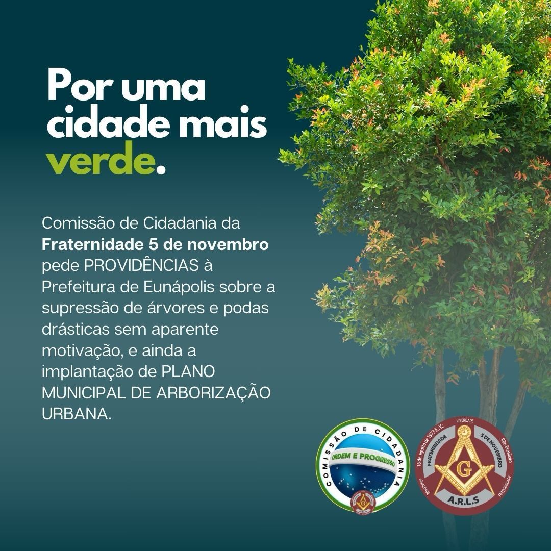 Nesse contexto, a Comissão de Cidadania da Loja Maçônica Fraternidade 05 de Novembro, amparada numa perspectiva da responsabilidade sócio-ambiental, solicitou formalmente à Prefeitura Municipal de Eunápolis a adoção de medidas urgentes para a elaboração e implementação de um Plano Municipal de Arborização Urbana.
