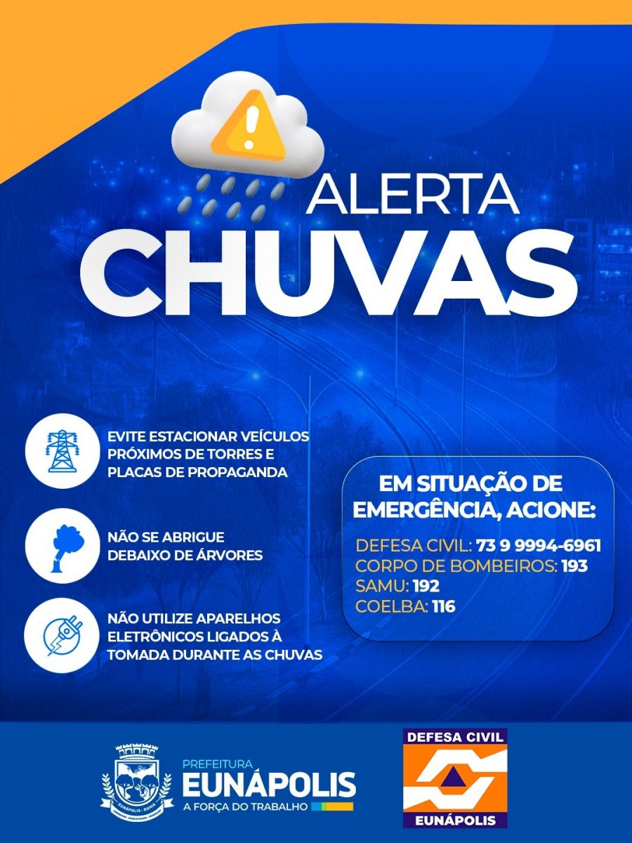 A Defesa Civil de Eunápolis informa que o Instituto Nacional de Meteorologia (INMET) emitiu um alerta de Perigo Potencial para chuvas intensas em diversas regiões da Bahia, incluindo o município de Eunápolis. O aviso é válido das 8h55 do dia 22 de outubro até as 10h do dia 25 de outubro, com previsão de precipitações entre 20 e 30 mm/h, podendo chegar a 50 mm/dia, além de ventos de 40 a 60 km/h.