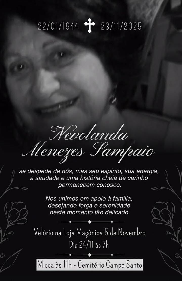 A comunidade eunapolitana se despede de Nevolanda Menezes Pampaio, que faleceu no domingo, 23 de novembro de 2025, aos 81 anos. Nascida em 22 de janeiro de 1944, Nevolanda deixa uma trajetória marcada por afeto, generosidade e uma história de vida que tocou profundamente familiares e amigos.