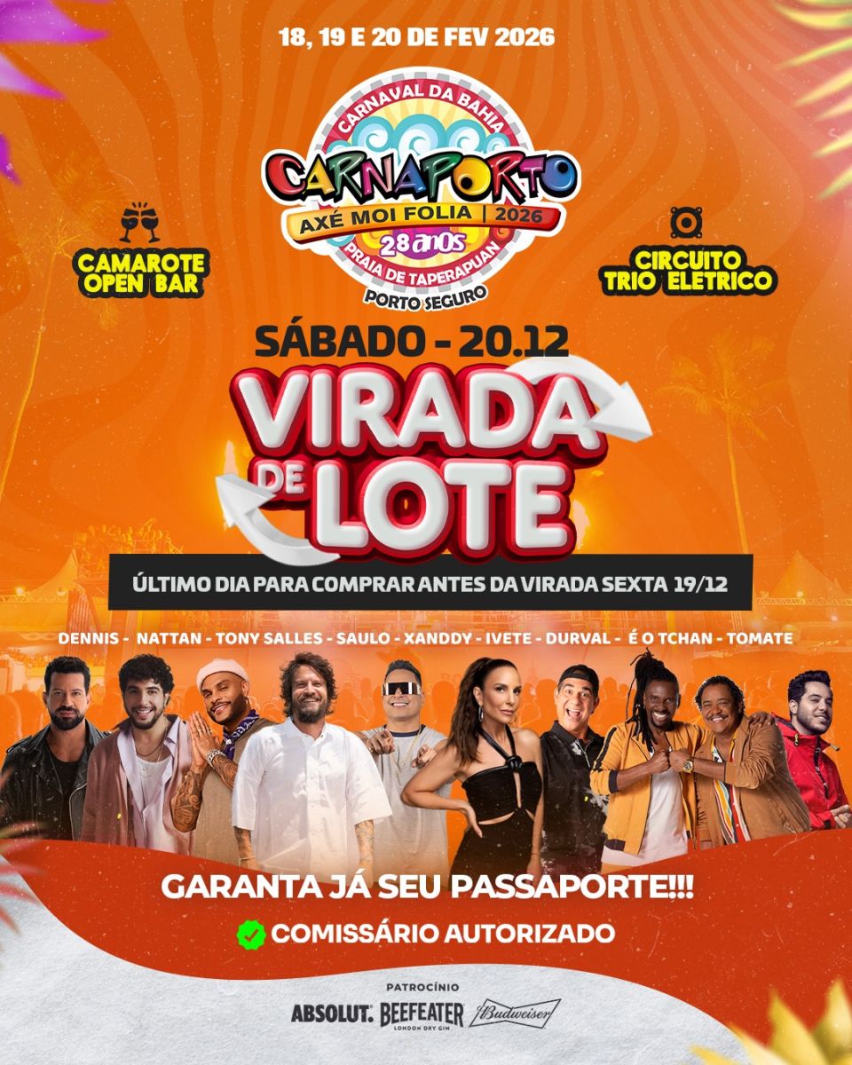 O Carnaporto Axé Moi 2026 entrará em seu quarto lote no dia 20 de dezembro. Você tem até o dia 19 de dezembro para garantir o seu no lote atual.
