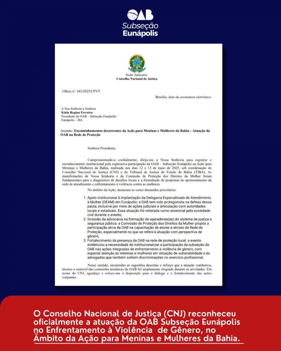 O Conselho Nacional de Justiça (CNJ), por meio do Ofício nº 143/2025/CPVT, reconheceu oficialmente a atuação da OAB Subseção Eunápolis no Enfrentamento à Violência de Gênero, no âmbito da Ação para Meninas e Mulheres da Bahia, realizada em maio de 2025, sob coordenação do CNJ e do TJBA. O reconhecimento representa uma importante conquista institucional da advocacia local.