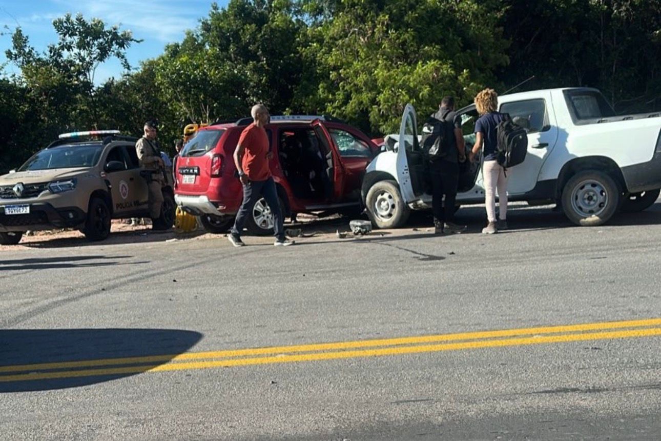 Segundo informações preliminares, os veículos trafegavam pela via quando colidiram frontalmente. Com a força da batida, os carros perderam o controle, saíram da pista e acabaram atingindo a motocicleta que estava estacionada às margens da rodovia.