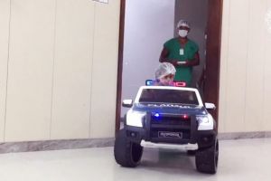 Hospital de Itabuna utiliza carro elétrico de brinquedo para transportar pacientes pediátricos ao centro cirúrgico