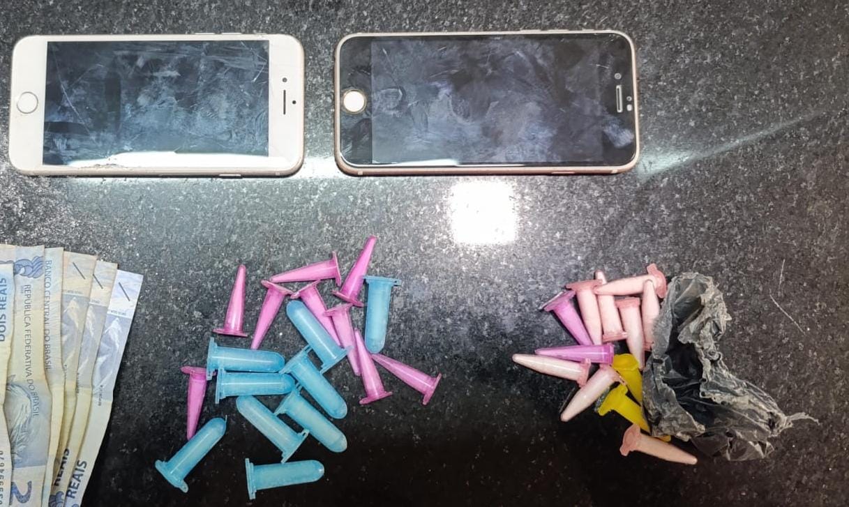 Ao perceberem a aproximação da viatura, os suspeitos tentaram fugir, mas dois deles foram alcançados e abordados. Durante a revista pessoal, os policiais encontraram 30 pinos de cocaína e uma bucha de maconha.