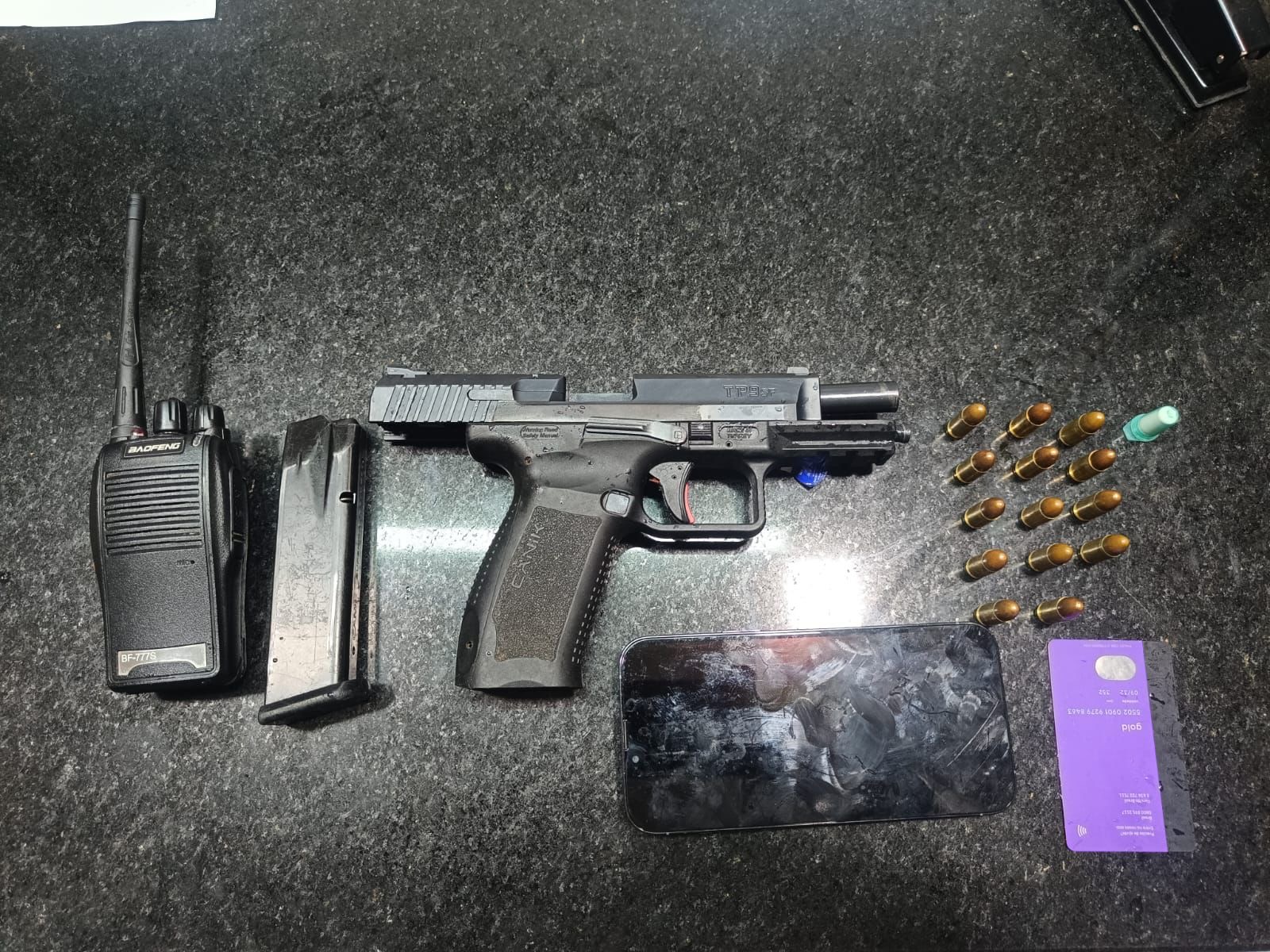 Durante a revista, os policiais encontraram com o suspeito uma pistola calibre 9mm, marca Canik, modelo TP9-SF, com numeração suprimida, acompanhada de carregador contendo 14 munições intactas. Também foram apreendidos um recipiente plástico com substância branca semelhante à cocaína, um rádio comunicador, um aparelho celular modelo iPhone 13 Pro Max, um cartão bancário e outros objetos pessoais.
