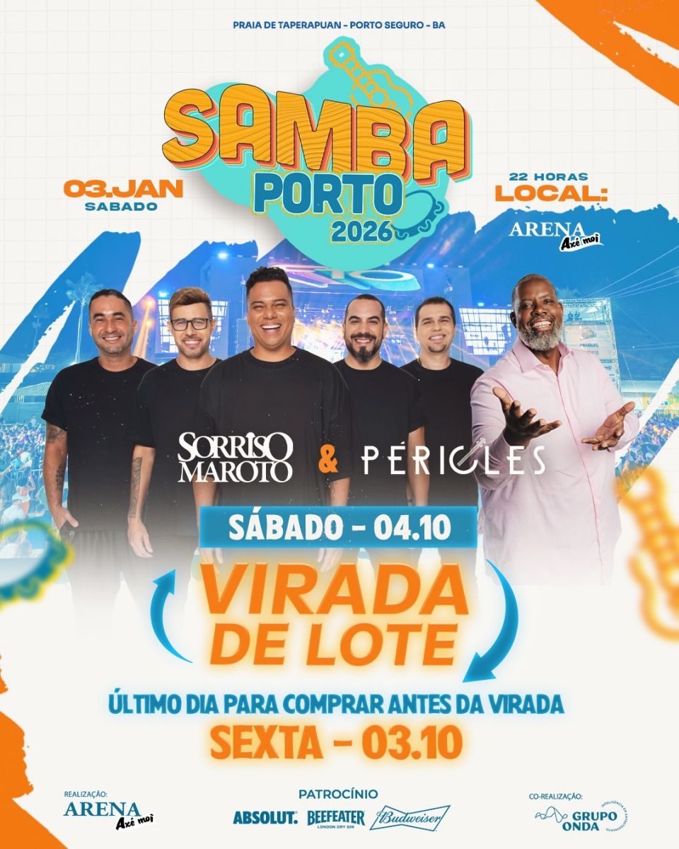 O seu primeiro sábado de 2026 tem local e hora marcadas para ser inesquecível: SAMBA PORTO na Arena Axé Moi, em Porto Seguro – Ba. Muito samba e pagode ao som de Sorriso Maroto e Péricles! Dois shows completos para você aproveitar!