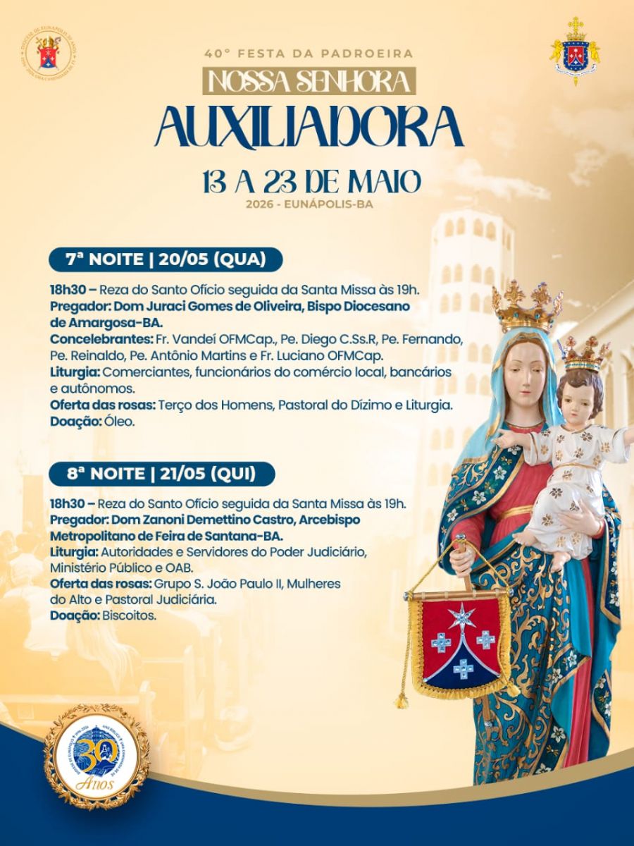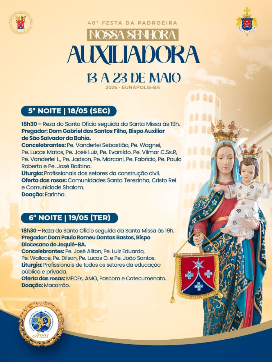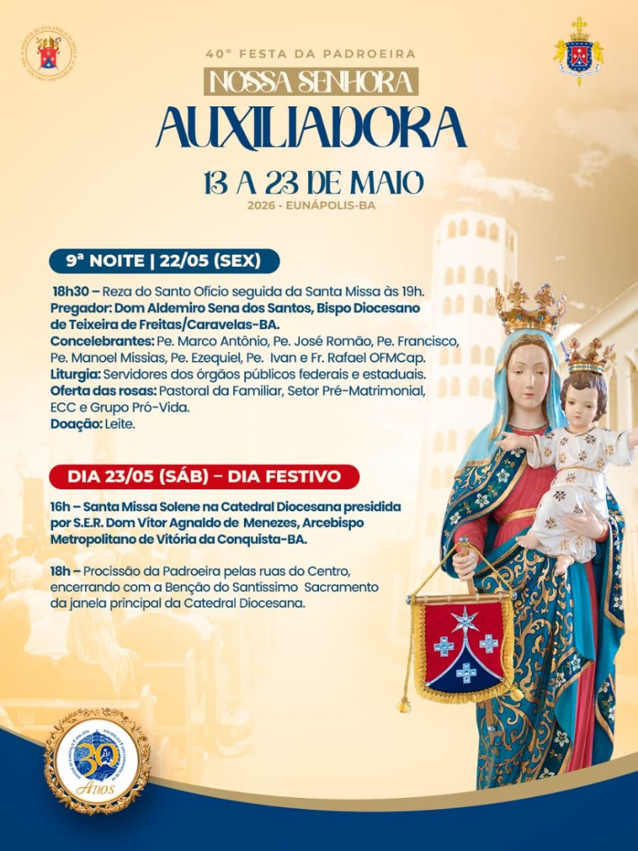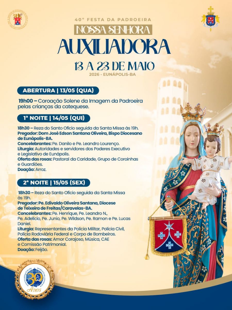 As celebrações a Nossa Senhora Auxiliadora começam dia 13 de maio com o novenário à padroeira de Eunápolis. O Ano Vocacional será celebrado com o tema “Nos 30 anos de nossa Diocese, a Rainha presente está : Pentecostes acontecerá. ”.