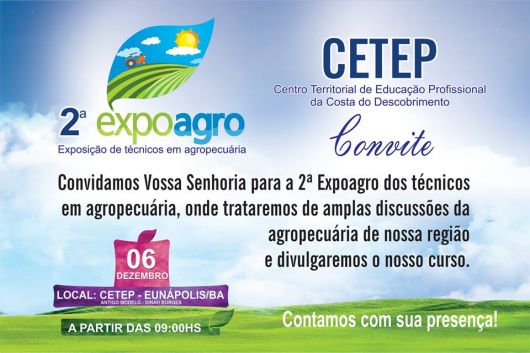 Próxima sexta-feira, a partir das 09:00 horas, no colégio CETEP (antigo Colégio Modelo), no bairro Dinah Borges. Na mesma, apresentaremos todo o potencial do curso, o primeiro da área na nossa cidade, e dos nossos futuros profissionais da área agrária (OS AGRICULINOS), além de comidas típicas e muita informação de qualidade.