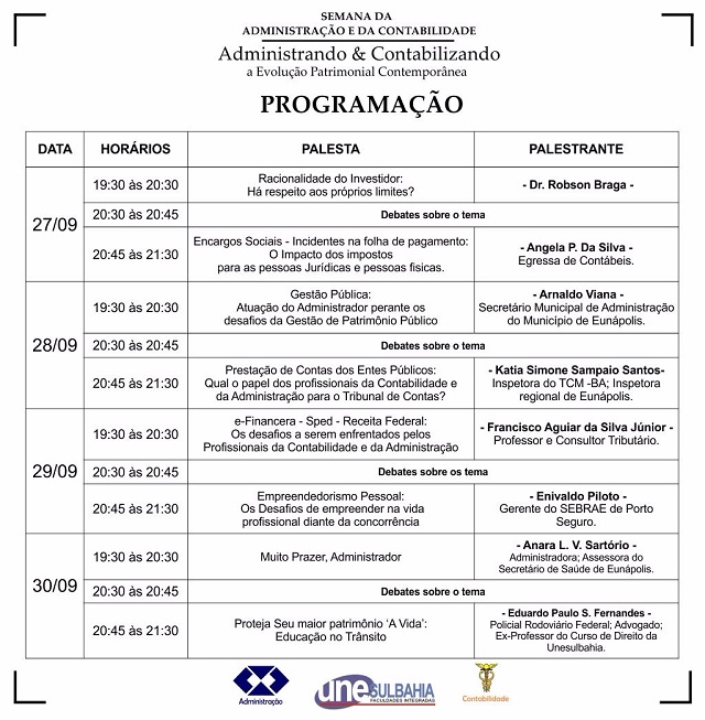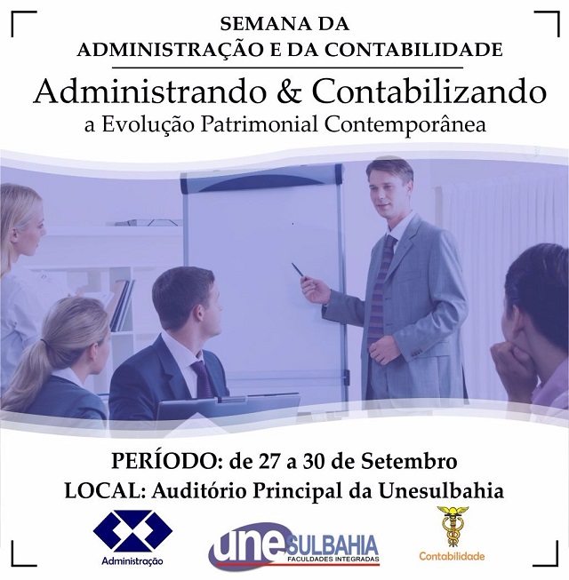 A Unesul Bahia Faculdades Integradas através das Coordenações dos Cursos de Administração e Ciências Contábeis está realizando “A Semana da Administração e da Contabilidade”, com o tema: Administrando & Contabilizando a Evolução Patrimonial Contemporânea.