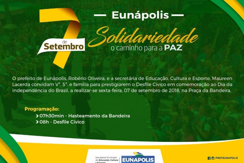 Com o tema ”Solidariedade: o caminho para a paz”, a Secretaria Municipal de Educação de Eunápolis anuncia o tradicional desfile cívico de 7 de Setembro no município, a partir das 08h da próxima sexta-feira nas ruas centrais da cidade.