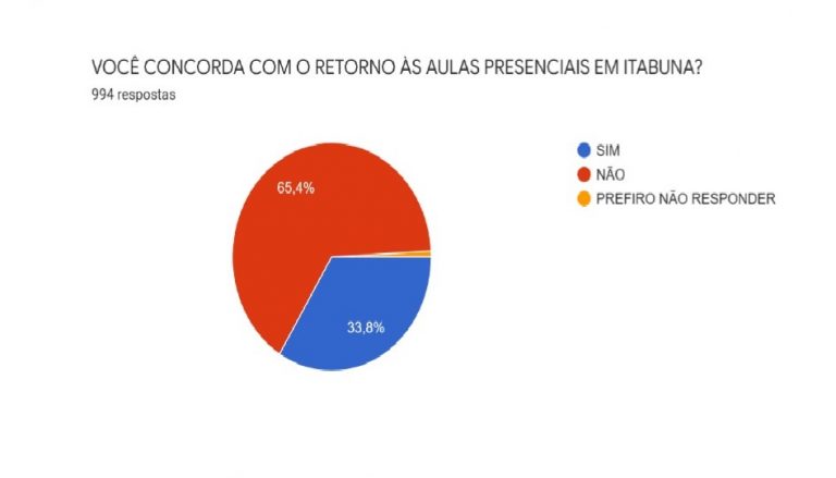 A Secretaria de Educação de Itabuna realizou uma Consulta Pública junto à população, durante a última semana, sobre o retorno às aulas presenciais. Pelo resultado, 65,4% da população são contra a retomada das aulas presenciais nas redes pública e privada de ensino.