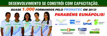 Todo país em desenvolvimento tem como uma de suas prioridades a formação profissional de sua classe trabalhadora, e em Eunápolis/BA esta preocupação é realidade na vida de quase mil formandos do Programa Federal PRONATEC - Programa Nacional de Acesso ao Ensino Técnico e Emprego. Referência nacional em números de cursos e formandos, a formatura 2014 do PRONATEC, em Eunápolis, receberá a visita de importantes governantes no cenário nacional, o Governador da Bahia, Jaques Wagner e a Ministra do Desenvolvimento Social e Combate à Fome, Tereza Campello.
