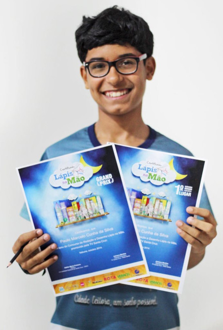 Um lápis, um papel e muita história para contar. Assim pode ser definida a experiência do estudante do Ensino Fundamental do Colégio Adventista de Eunápolis, Paulo Marcelo Cunha da Silva, 13 anos, com a 5ª edição do Projeto Lápis na Mão. No último dia 22/10, no Auditório da Universidade Estadual de Santa (UESC), ele foi consagrado como 1º lugar no Concurso de Redação do Projeto Lápis na Mão, em sua categoria, e ainda teve o seu texto selecionado no Grand Prix de Redação, sendo considerado o melhor texto de todas as categorias. O Projeto Lápis na Mão é uma realização da TV Santa Cruz, em parceria com a Veracel Celulose e instituições públicas e privadas da região, e busca envolver professores, estudantes e comunidades do Sul e Extremo Sul da Bahia em atividades de incentivo à educação.