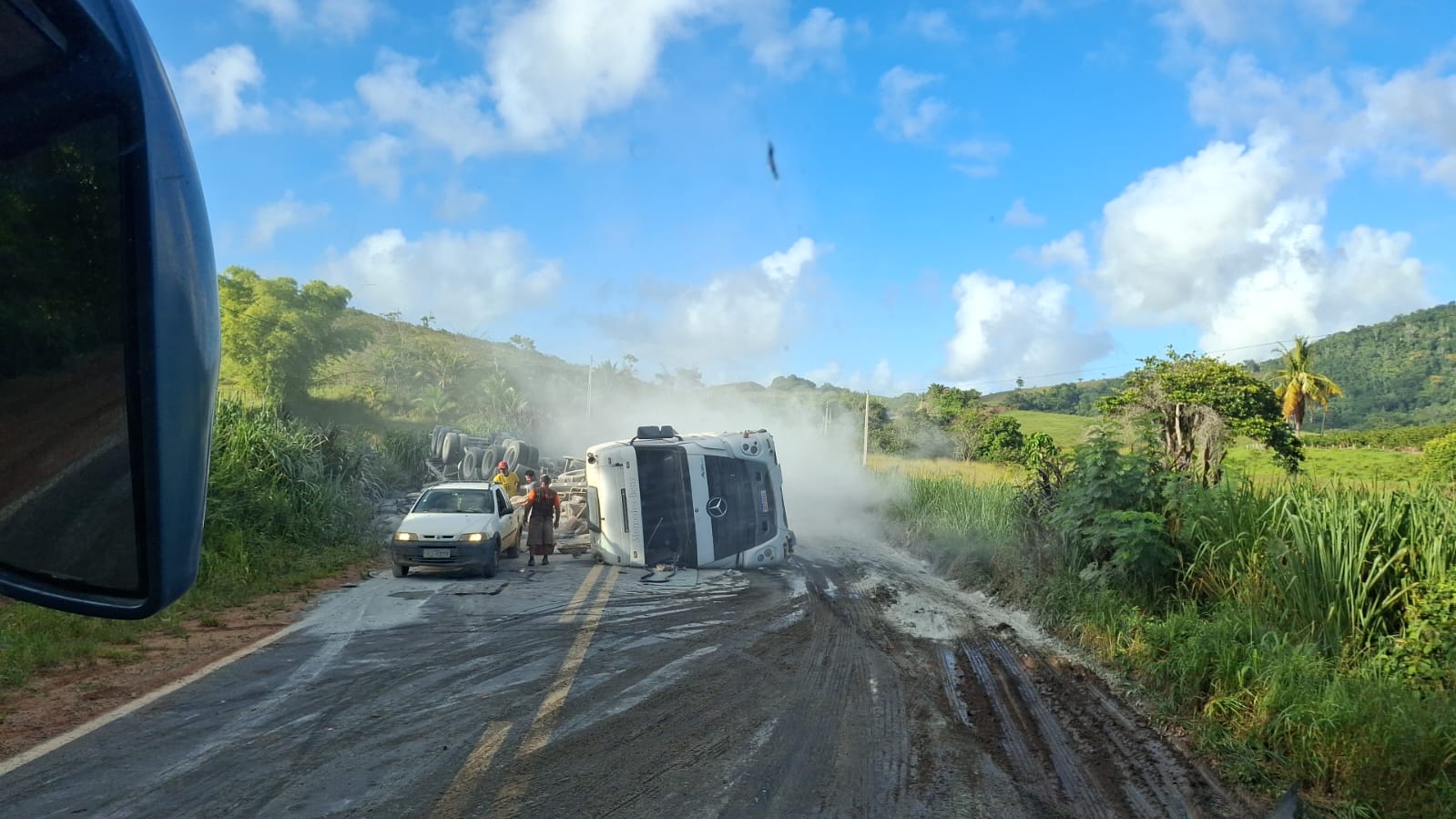 Um acidente envolvendo uma carreta carregada de cimento foi registrado na manhã desta terça-feira (27) na BR-101, nas imediações do município de Itabela, no extremo sul da Bahia. O veículo tombou e ficou atravessado parcialmente na pista, chamando a atenção de quem passava pelo local.