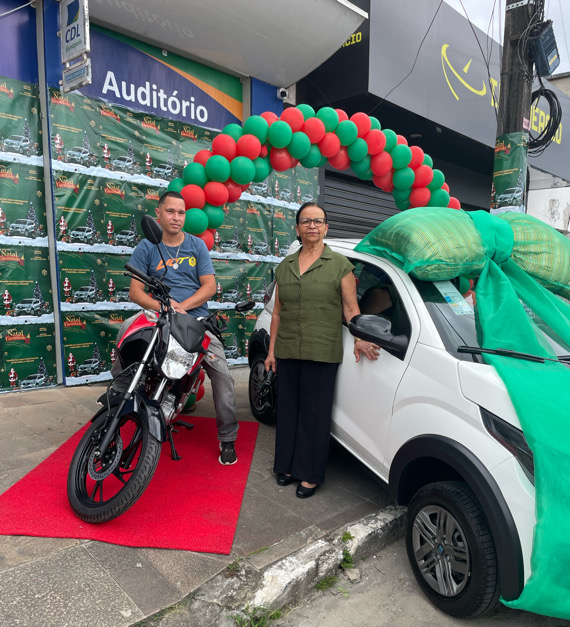 O grande prêmio da campanha, um carro Fiat Mobi, foi entregue à Maria de Lurdes Souza Santos, moradora de Eunápolis, que participou da promoção após realizar compras na loja Mega Lar. Já a moto CG Titan teve como ganhador Leandro Rosa de Jesus, morador do município de Mucuri, evidenciando o alcance regional da campanha.