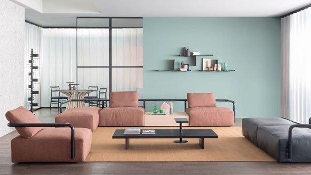A Cassina apostou forte nos tons adocicados e leves, a exemplo desta sala de estar escultural e com toques generosos de candy colors. Graças às linhas e volumes contidos, o visual alcançado passa longe do lúdico e traz sofisticação ao décor. Destaque para o tapete em tom de pêssego.