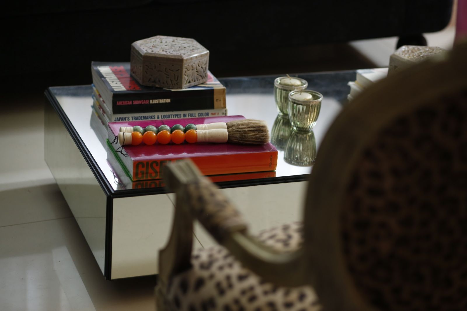 Apesar de tantas memórias, Marcela não precisou ir tão longe para achar o grande xodó da decoração do apartamento: um biombo chinês. Desenhada de forma artesanal, a peça, que separa o living da sala de TV, foi adquirida num antiquário em São Paulo e logo virou o elemento chave da casa. "É meu objeto favorito, sou doida nele. Toda a minha decoração foi planejada a partir desse biombo", confessa.