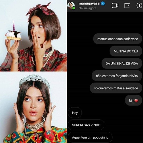 Em print divulgado pelo perfil Nana Rude, Manu respondeu a um fã superfiel, o Natan Rickson. "Hey. SURPRESAS VINDO. Aguentem um pouquinho", escreveu.