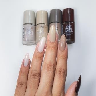 2° Escolha 4 cores em tons de nude que formem um degradê de cores. Aqui foram usadas do dedão para o mindinho as cores Acertei, Na Medida, Relax e Ritmo Certo, sendo que esta última foi aplicada nas unhas do dedo anelar e mindinho;