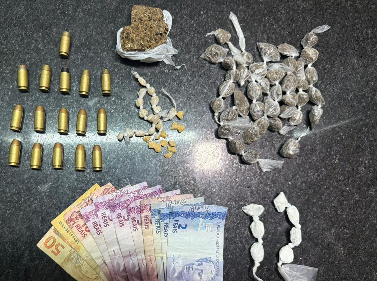 Após a troca de tiros, os suspeitos conseguiram fugir por uma área de mata. Durante a varredura no local, os policiais encontraram 40 buchas de maconha, um pedaço maior da mesma droga, sete buchas de cocaína, 28 pedras de crack e 16 munições calibre .40.