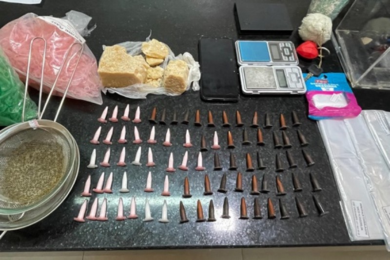 A dupla foi alcançada na Rua Campos Sales. Durante a abordagem, um dos envolvidos, menor de idade, tentou dispensar uma sacola contendo aproximadamente 300 gramas de crack. O segundo indivíduo foi localizado dentro de uma residência, onde os policiais apreenderam uma mochila com 78 pinos de cocaína, duas balanças de precisão, duas peneiras e centenas de embalagens plásticas do tipo ependorf, utilizadas para o acondicionamento de entorpecentes.