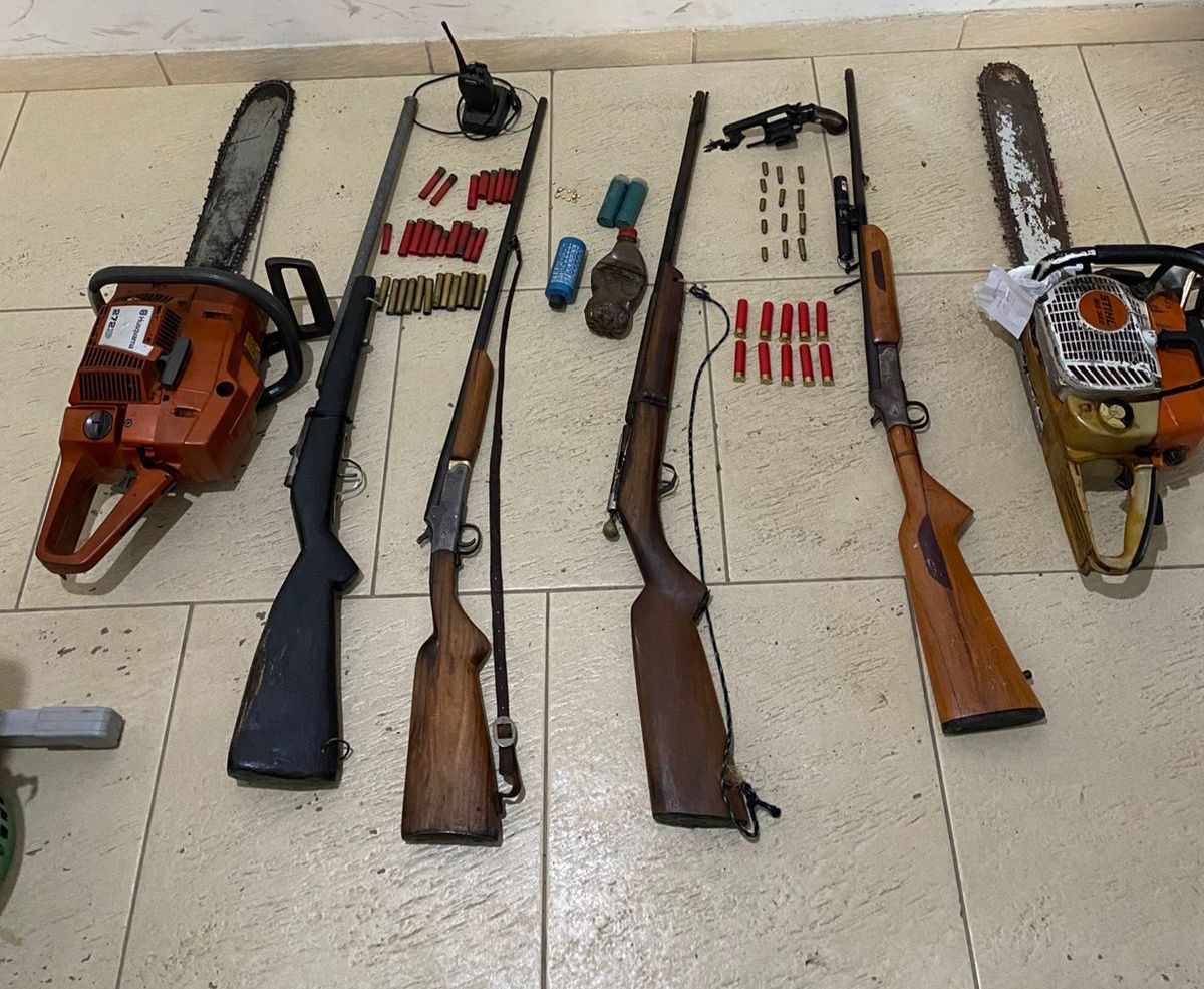 Nas diligências realizadas no local, os investigadores encontraram cinco armas de fogo, entre elas um revólver e espingardas de diferentes calibres. Também foram apreendidas munições, espoletas, pólvora e materiais utilizados para recarga artesanal de cartuchos.