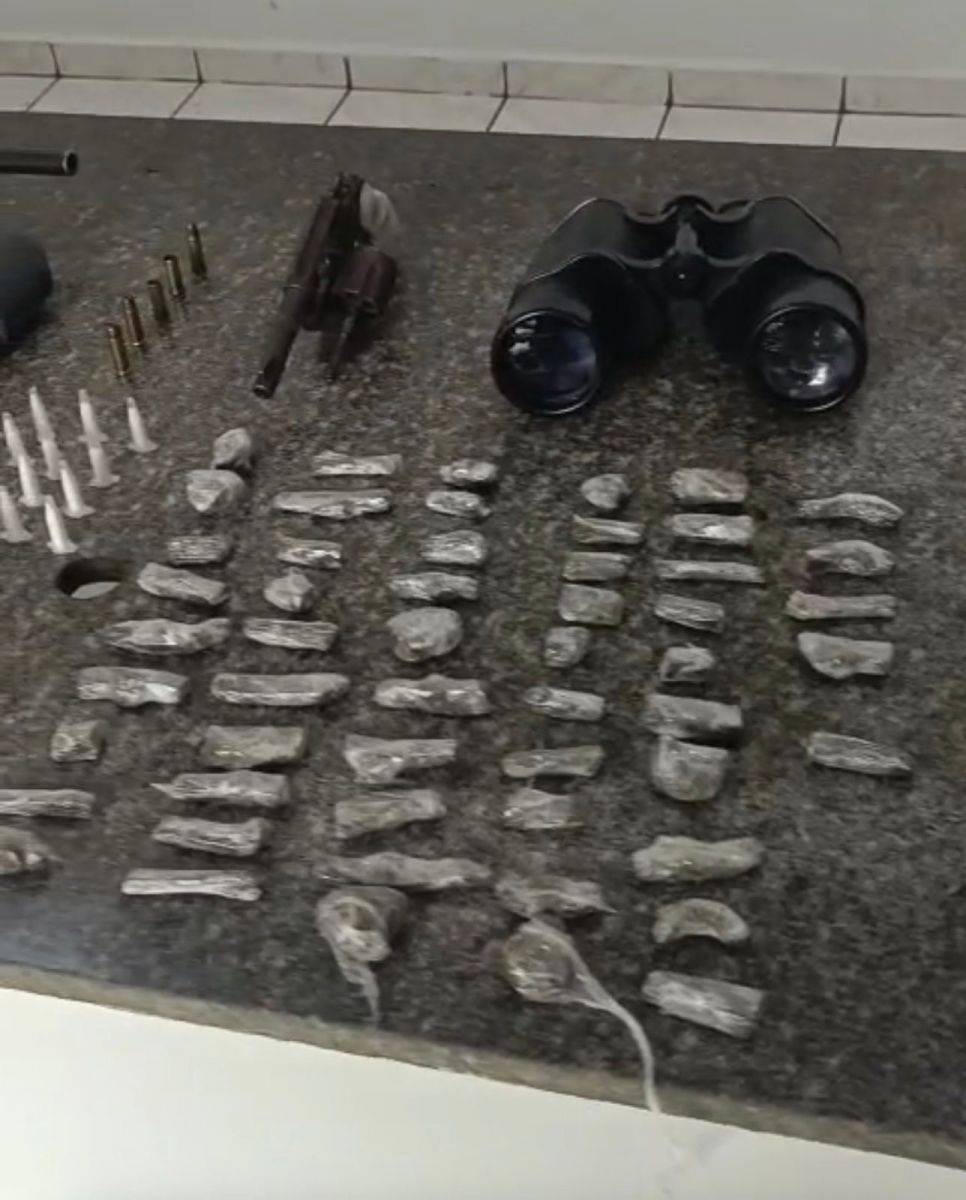 Durante a ação, os policiais apreenderam uma carabina calibre 9mm, um revólver calibre .32, aproximadamente 520 gramas de maconha, 43 gramas de crack, 27 gramas de cocaína, dois binóculos, além de munições e estojos de diversos calibres.
