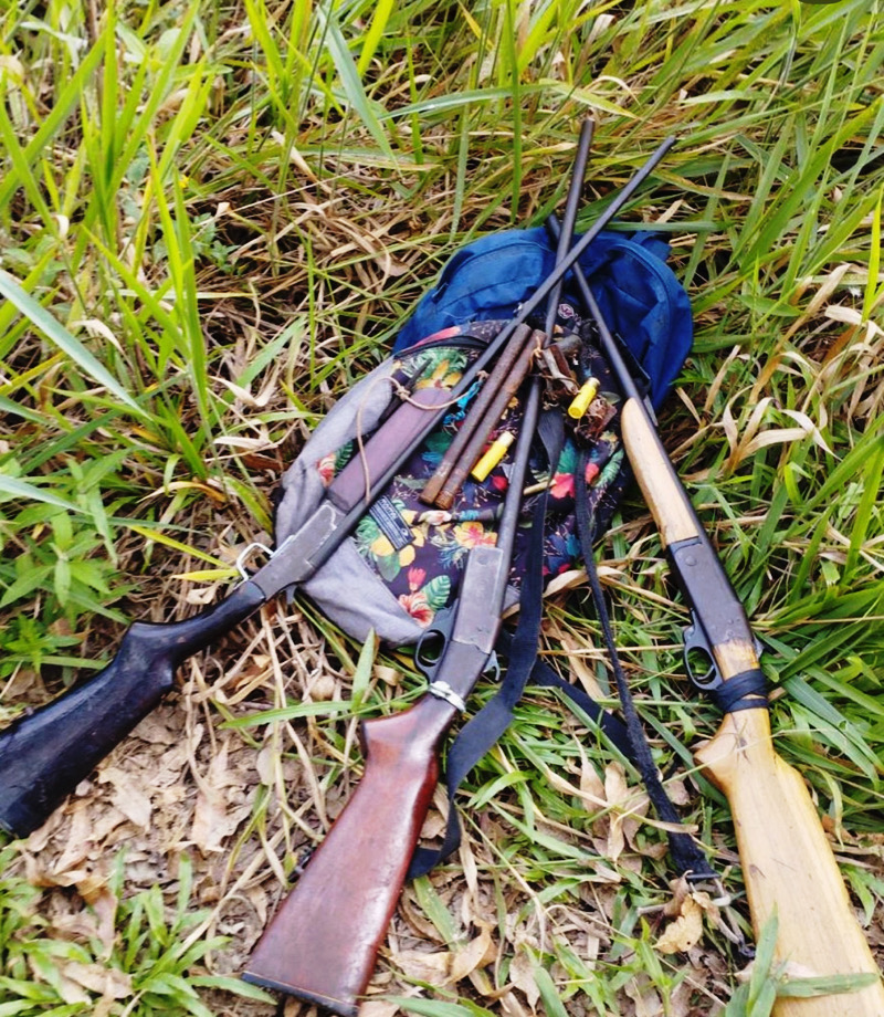 Apesar das buscas, os suspeitos não foram localizados, devido à dificuldade de acesso causada pela vegetação fechada. No entanto, durante a varredura na área, foi encontrada uma mochila abandonada contendo três espingardas, de calibres 32, .40 e 20, além de cartuchos e outros materiais utilizados na caça.