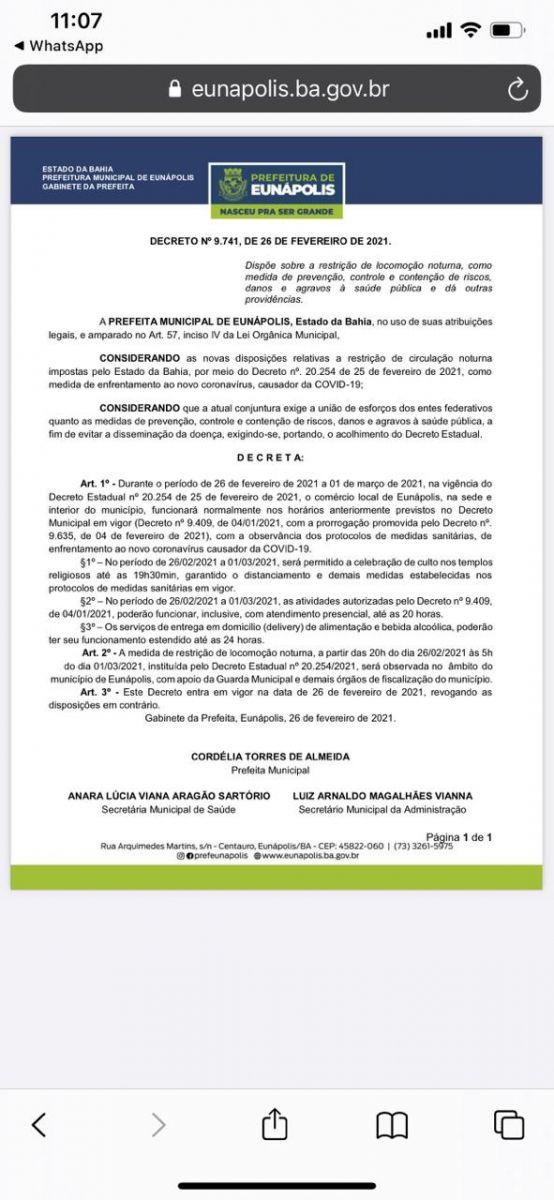 A Prefeitura de Eunápolis decretou novo horário de funcionamento de estabelecimentos e atividades econômicas no município, entre os dias 26 de fevereiro e 1º de março. A decisão, publicada no Diário Oficial de hoje, 27, estabelece que está restrita a locomoção noturna, a permanência e o trânsito em vias, equipamentos, locais e praças públicas, a partir das 20h e até as 05h.