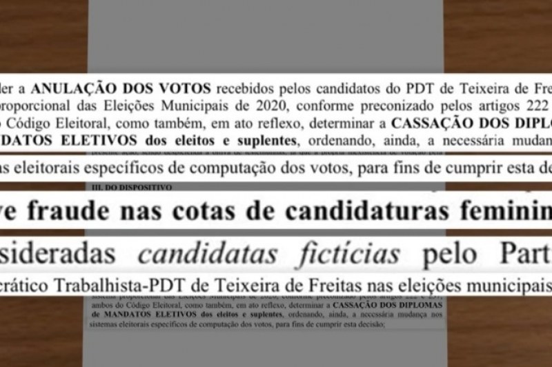 Os vereadores de Teixeira de Freitas, no extremo sul baiano, Marcos Gomes de Almeida e Carmino Oliveira Santana e um suplente, todos do Partido Democrático Trabalhista (PDT), tiveram seus mandatos cassados pela Justiça Eleitoral. Eles são suspeitos de terem usado, nas eleições de 2020, a cota de gênero para concorrer às vagas.
