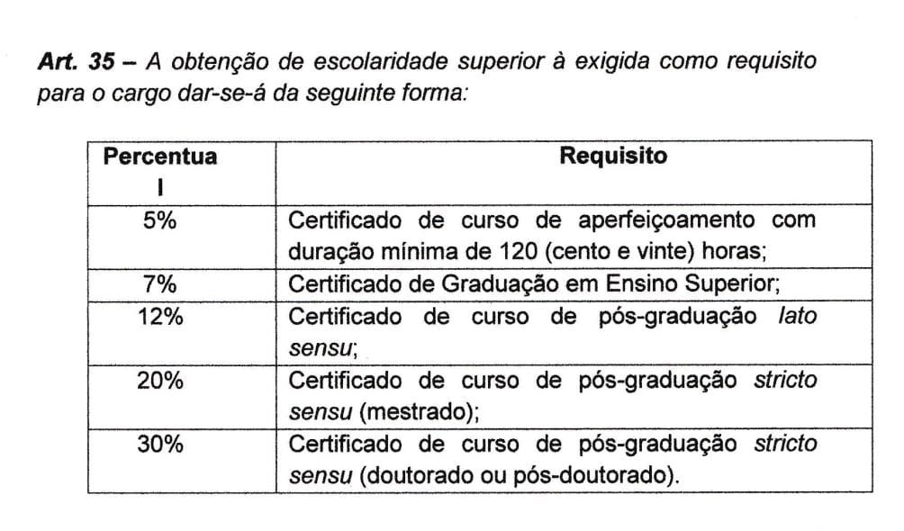 A obtenção de escolaridade superior à exigida como requisito para o cargo dar-se-á de acordo com a tabela abaixo: